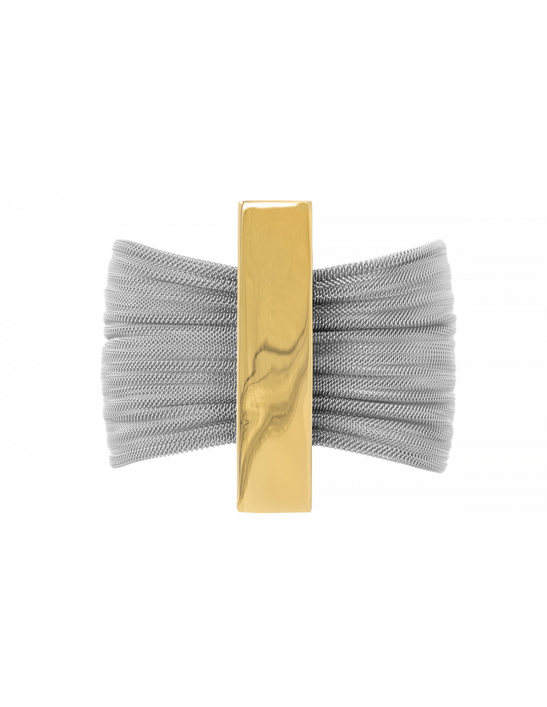 Bracelet made of wide stainless steel mesh and gold-plated steel with a magnetic clasp.