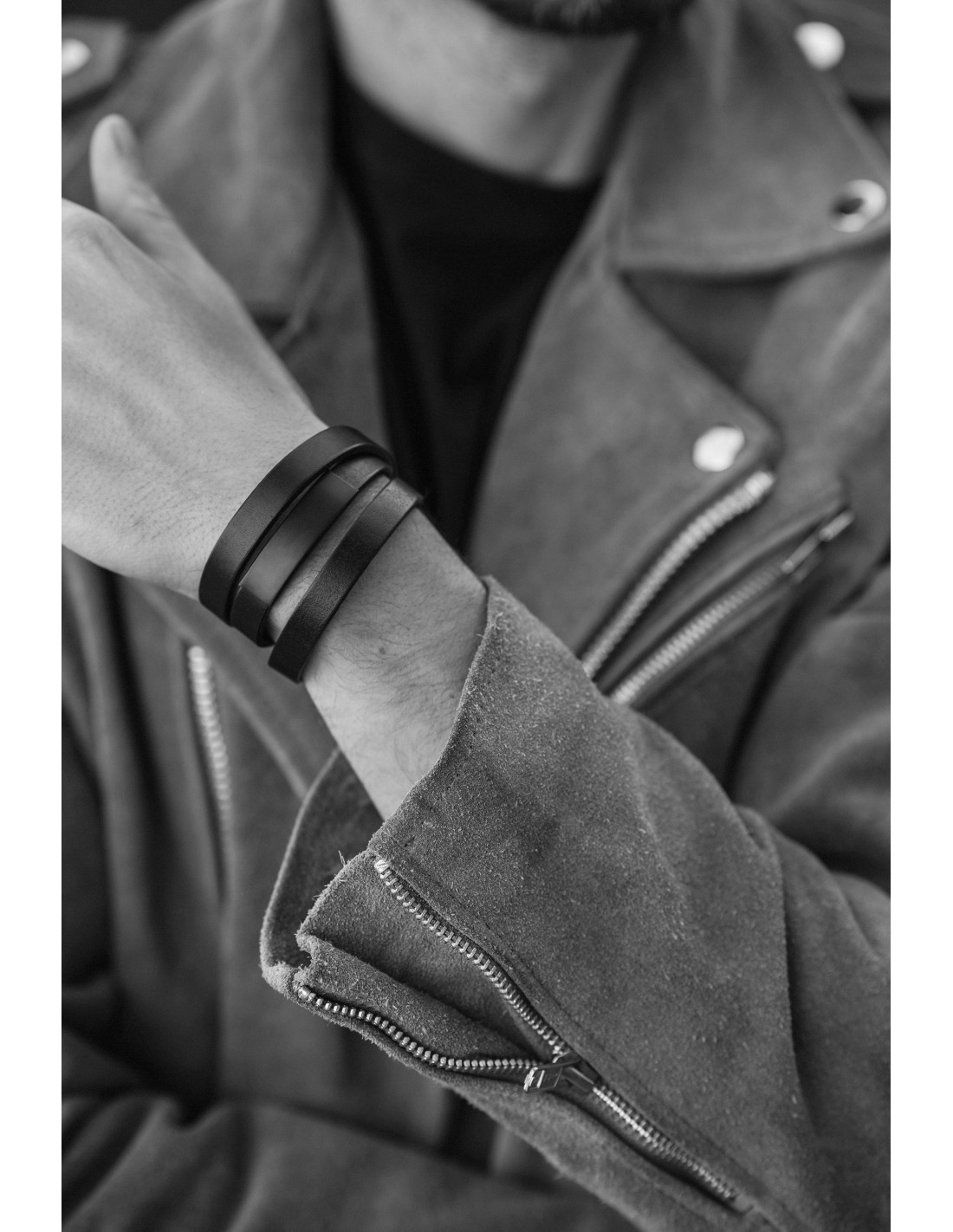 The matte black magnetic clasp creates a raw, cohesive look with the wide leather band.