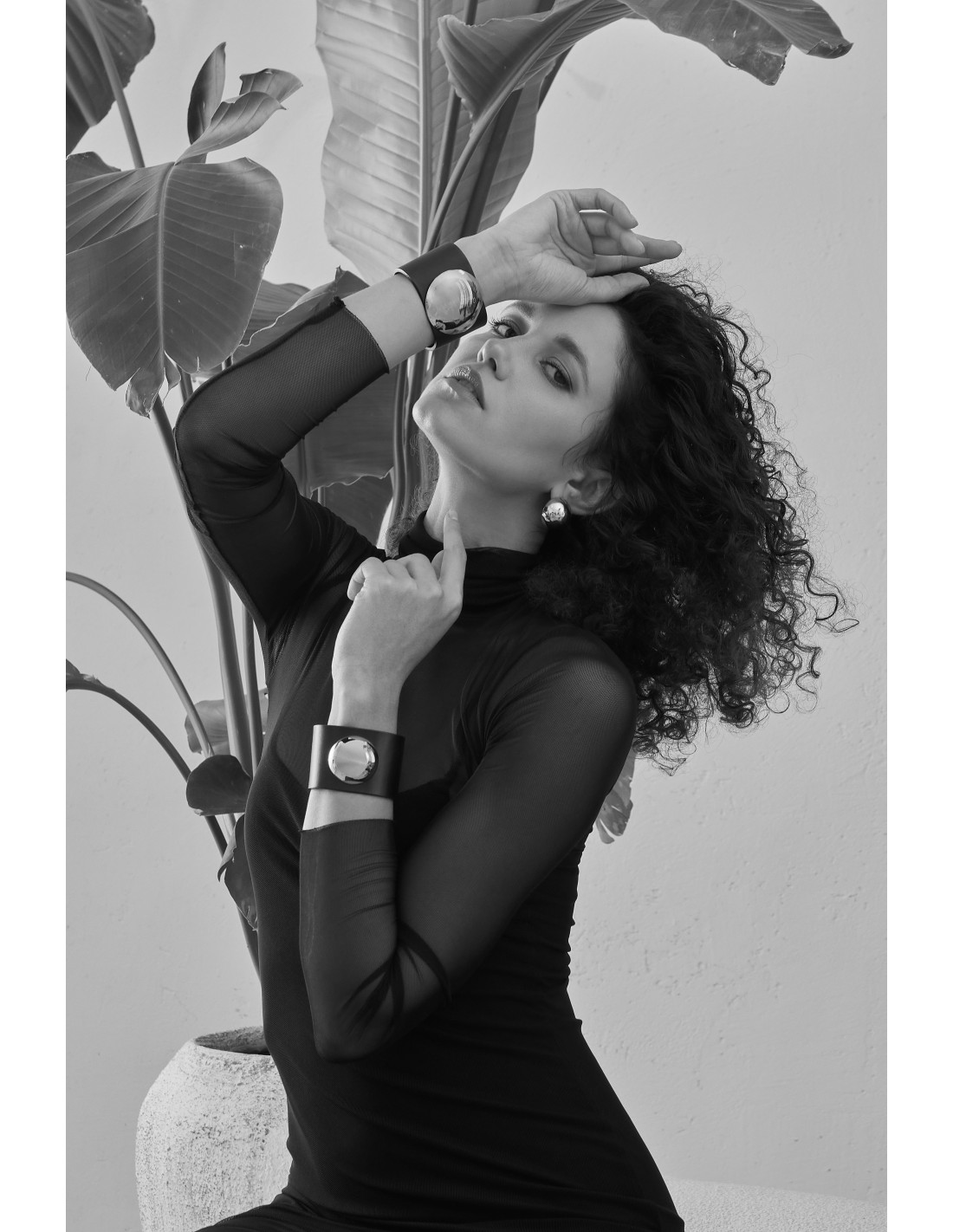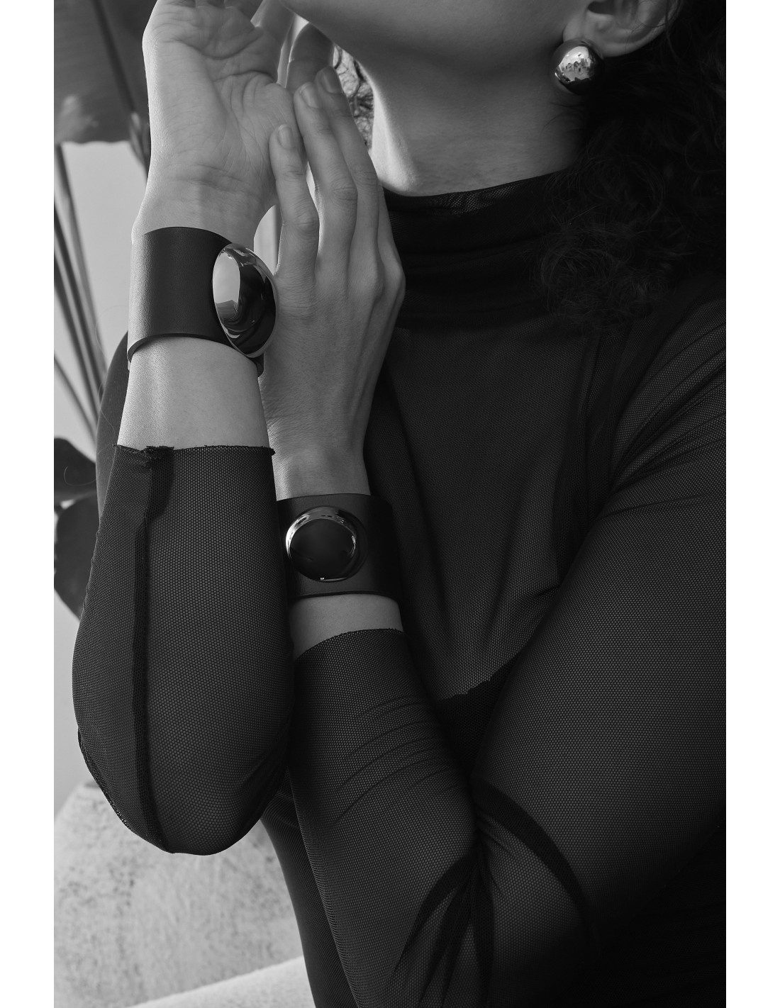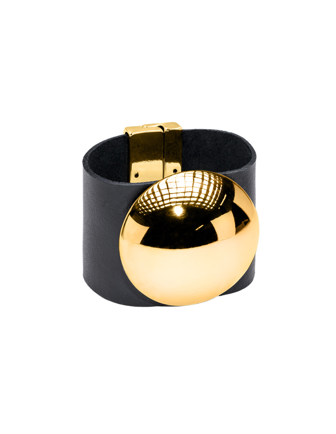 This wide black leather bracelet with a gold-plated steel half-sphere is a bold, timeless piece. Perfect worn alone or as part of a matching jewelry set.Product code: BSpz025
