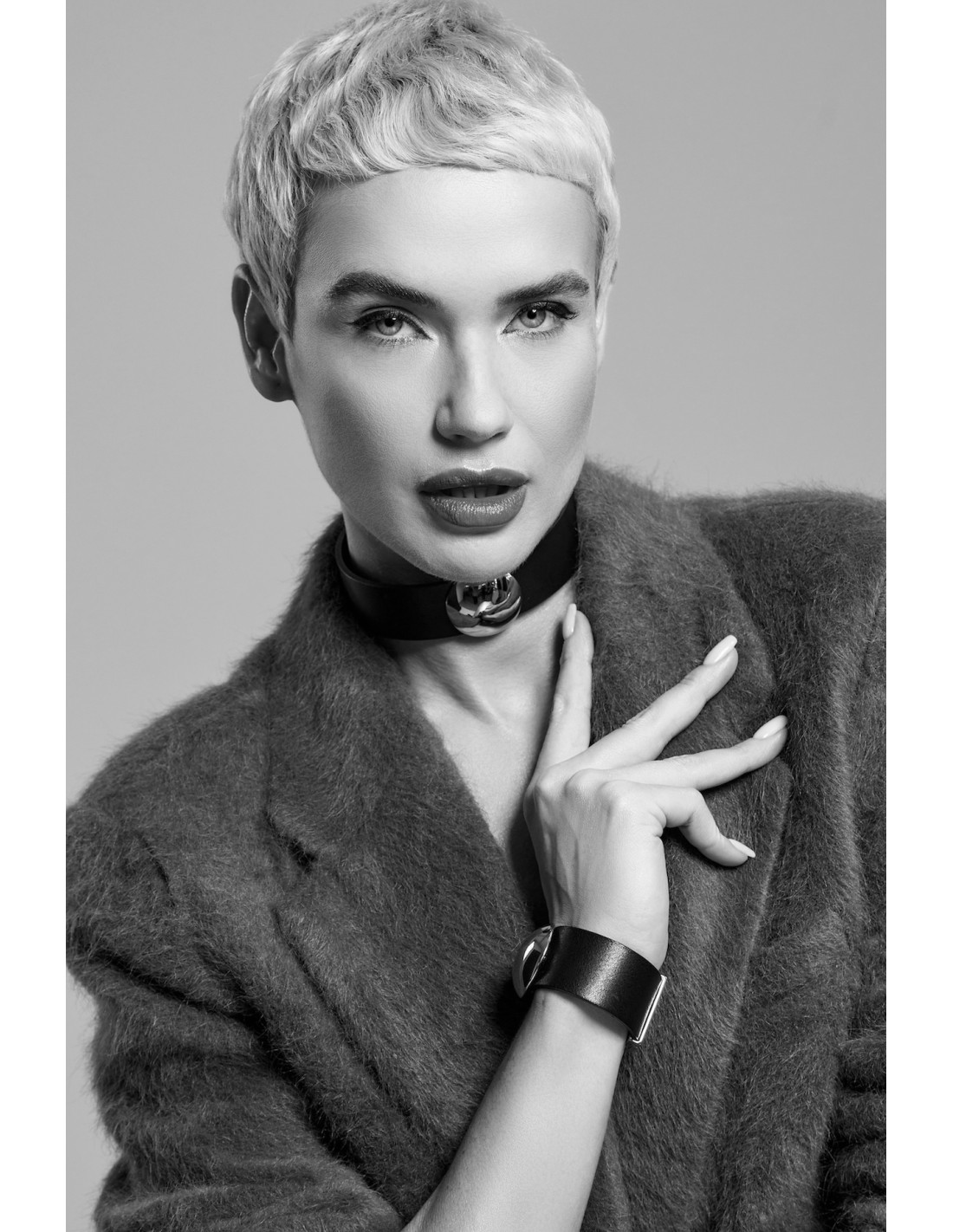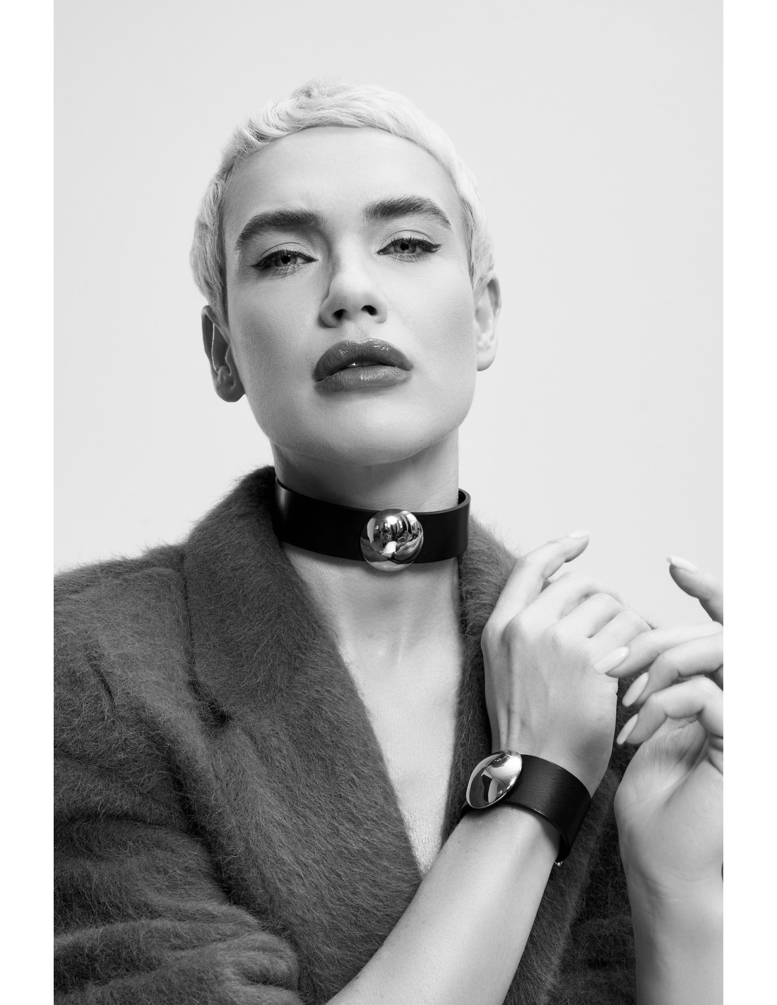 A modern and timeless choker necklace made of soft, hand-stitched genuine leather and gold-plated stainless steel with a glossy sphere. Perfect for those who value minimalism, elegance, and unique jewelry design.Product code: NSpz017