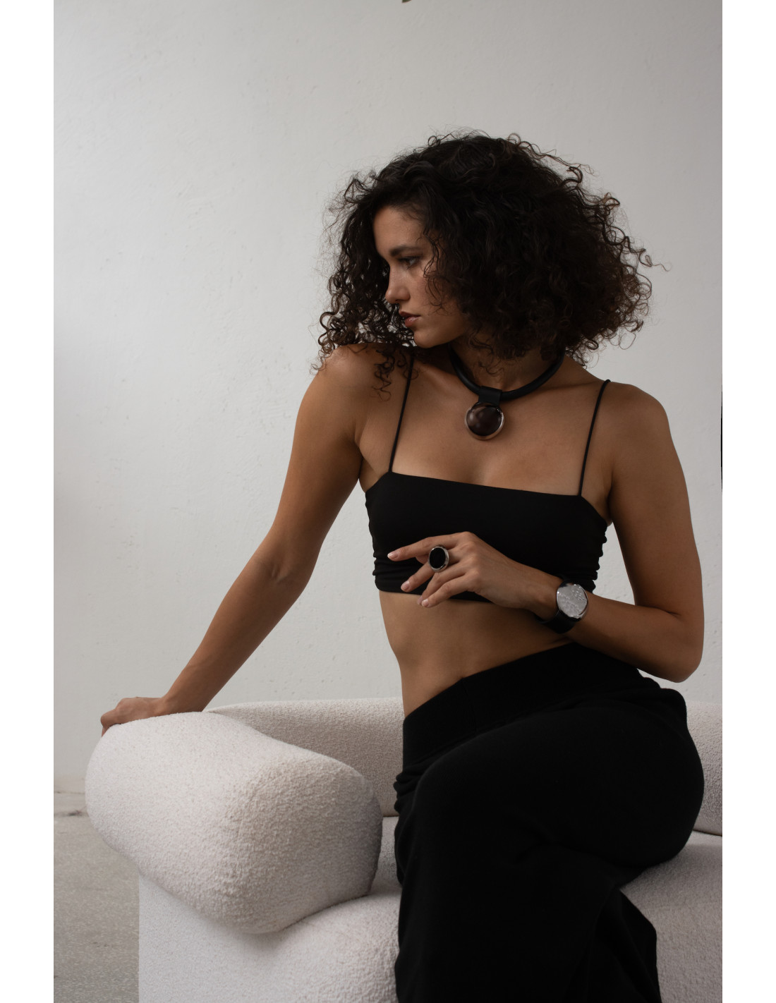A minimalist necklace made of natural leather and stainless steel with an elegant sphere. A versatile accessory that works perfectly for both everyday wear and special occasions.