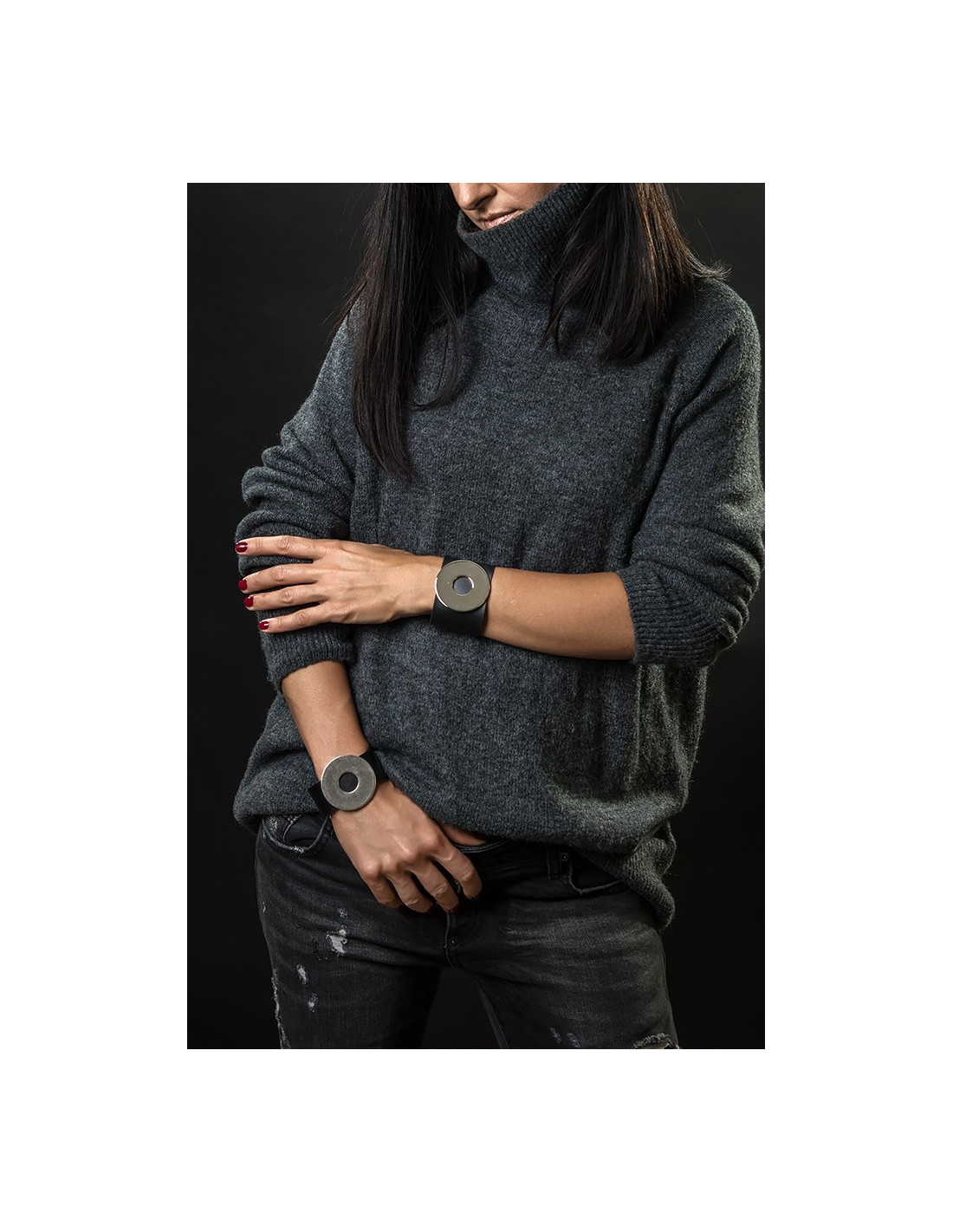 This black leather bracelet with a matte steel circle offers a bold, modern design with a minimalist edge. Perfect worn alone or as part of a matching set.Product code: BSpm007