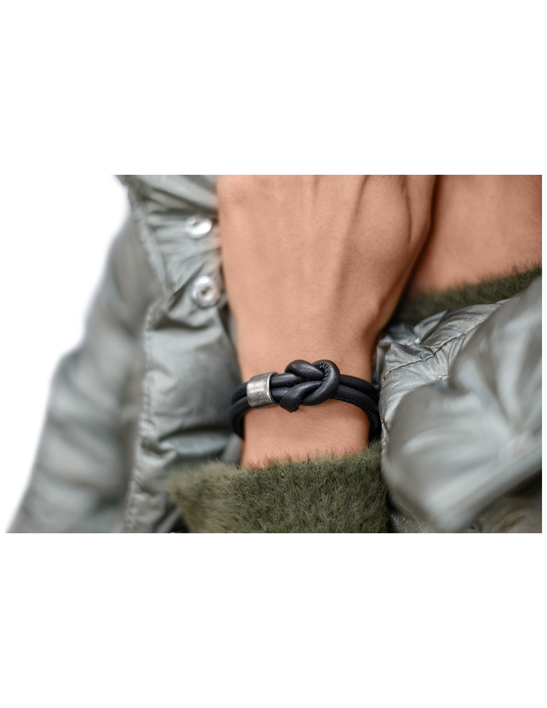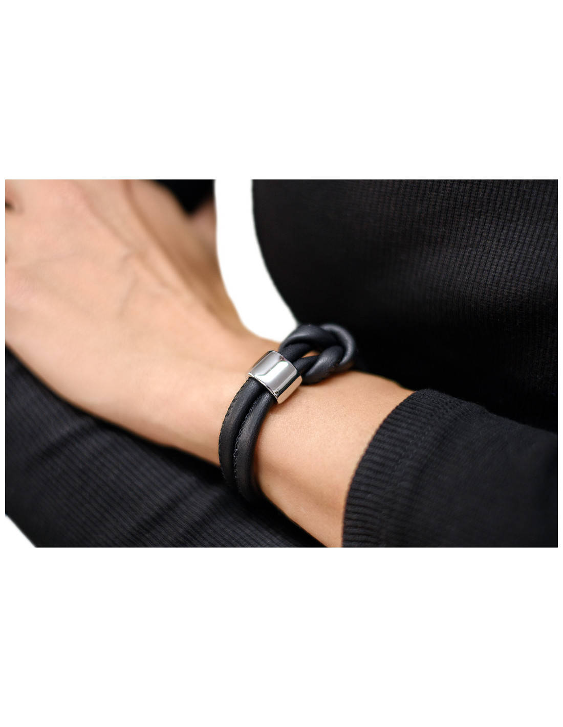Handcrafted black leather bracelet with a matte stainless steel accent. A minimalist design combining natural leather with the durability of steel.