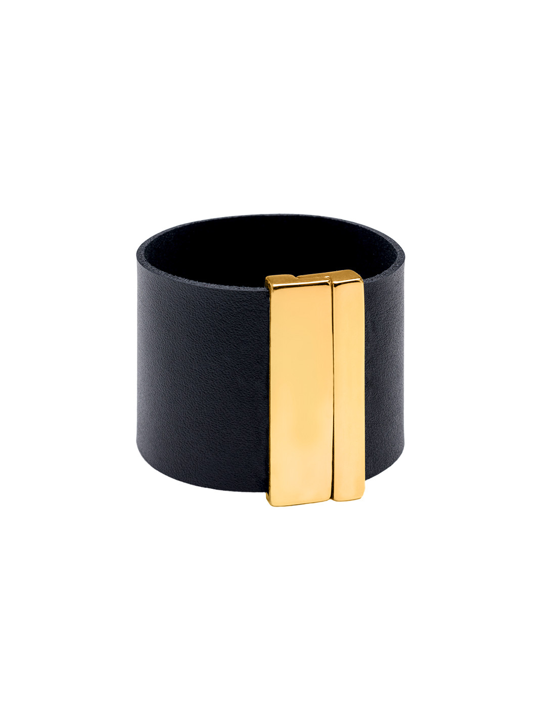 Modern bracelet made from black leather and gold-plated stainless steel with a magnetic clasp. Handcrafted, classic, and elegant in form.Product code: BSz002