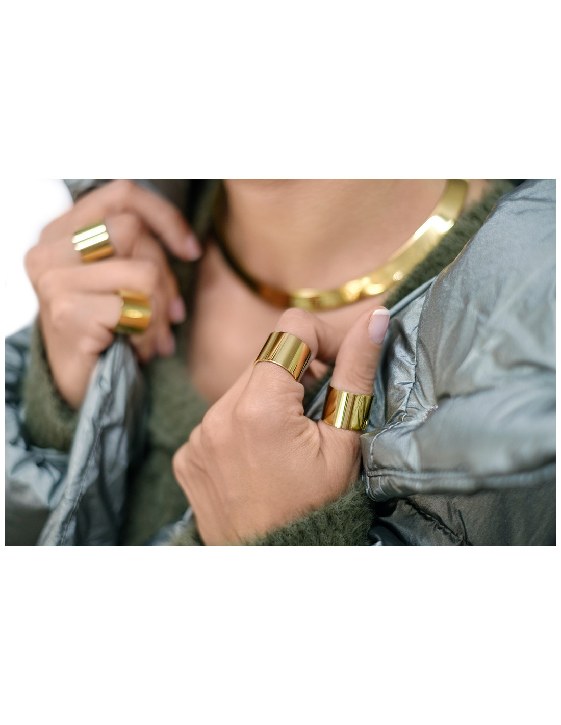 A minimalist wide band ring made of gold-plated stainless steel. Slightly adjustable, timeless, and perfect for any style.Product code: PST016