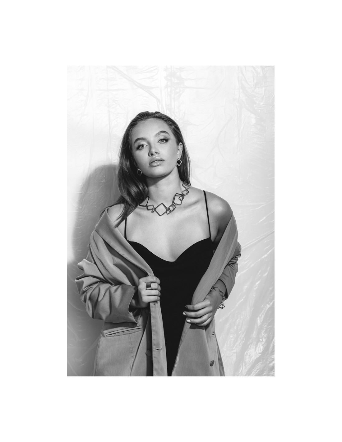 A modern long 3D necklace made of silver stainless steel. Elegant, minimalist and timeless jewelry for any occasion.Product code: NST076