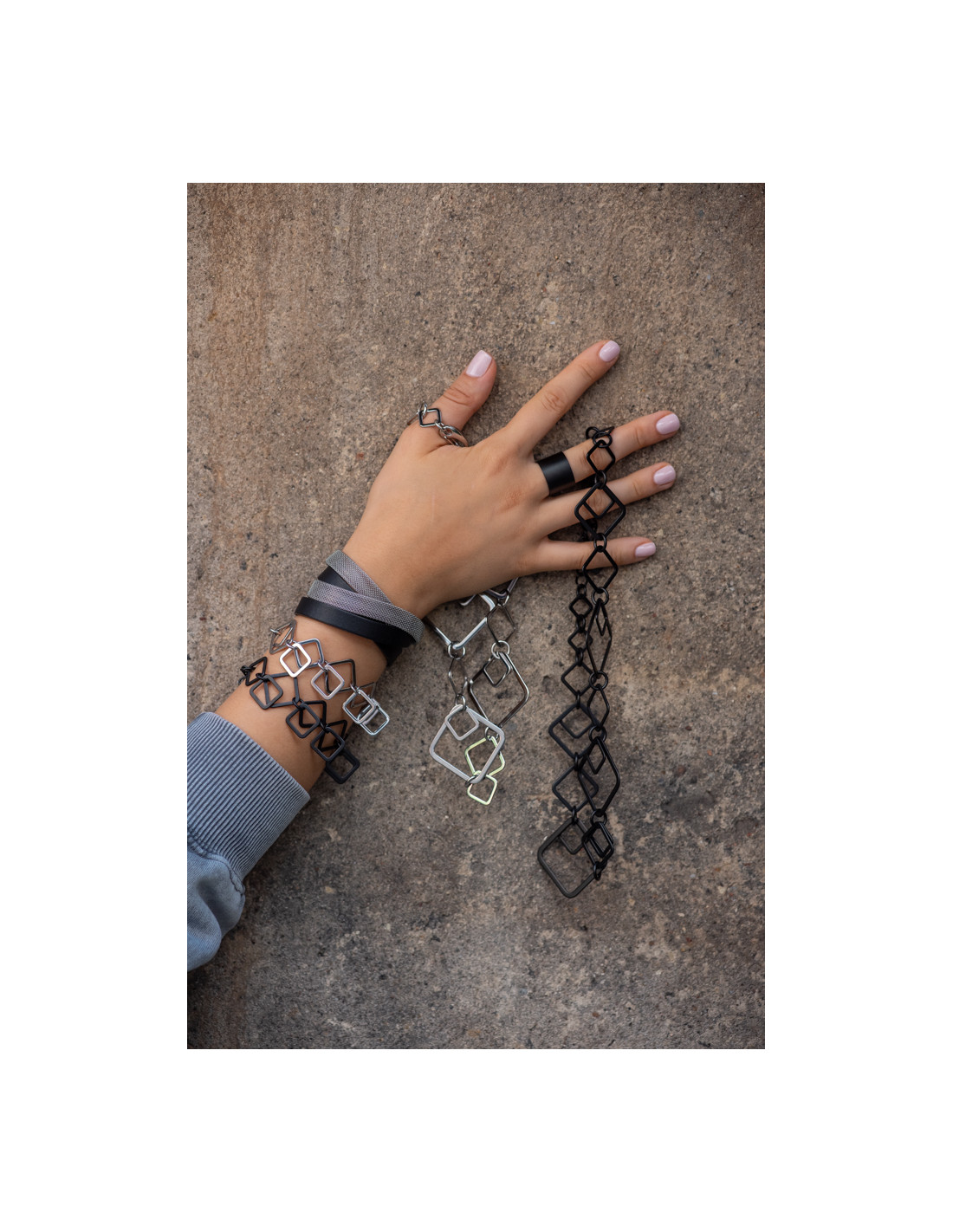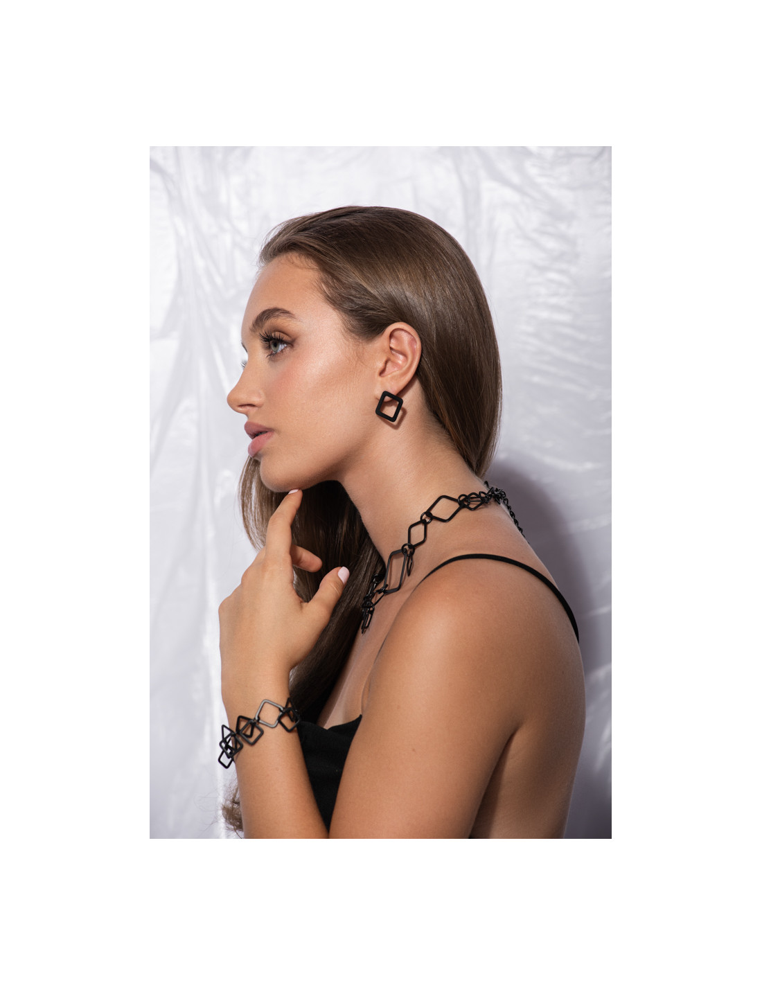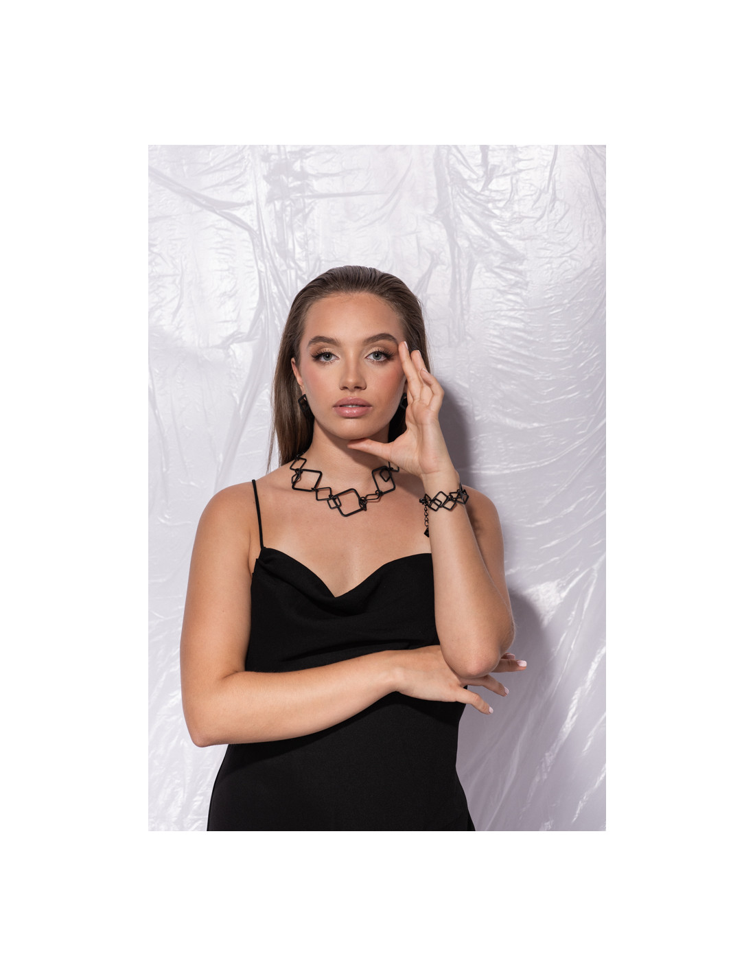 The beautiful and timeless 3D set made of black matte stainless steel is an elegant choice for those who appreciate modern style and coordinated accessories. The set includes a necklace and a bracelet, creating a perfect balance of minimalism and character.Product code: KMSTcz012