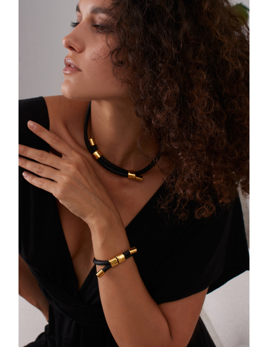 Minimalist necklace made of black leather and gold-plated stainless steel elements. Adjustable design, modern elegance.