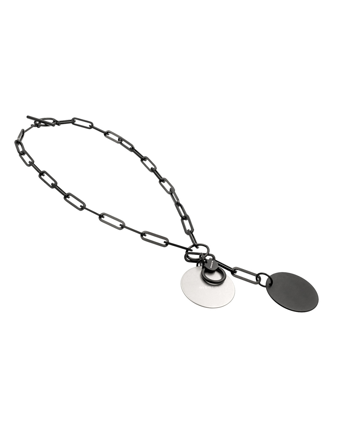 An original, eye-catching matte black necklace with large links and decorative pendants.