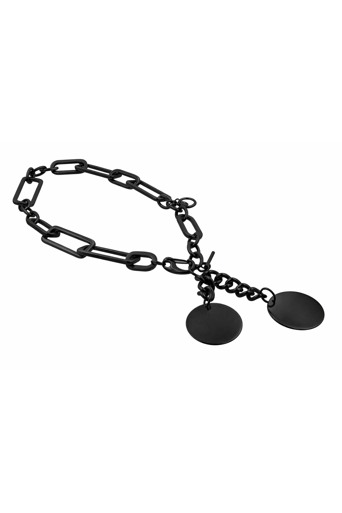 An original, eye-catching matte black necklace with large links and decorative pendants.