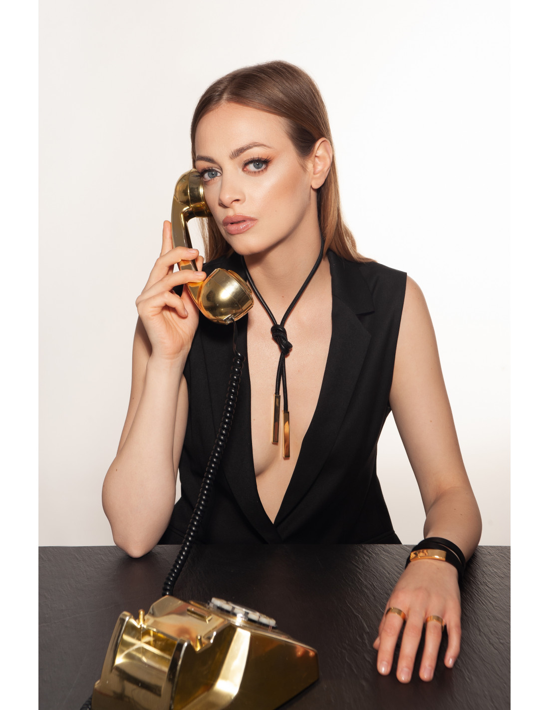 Minimalist necklace made of black leather and gold-plated stainless steel elements. Adjustable design, modern elegance.