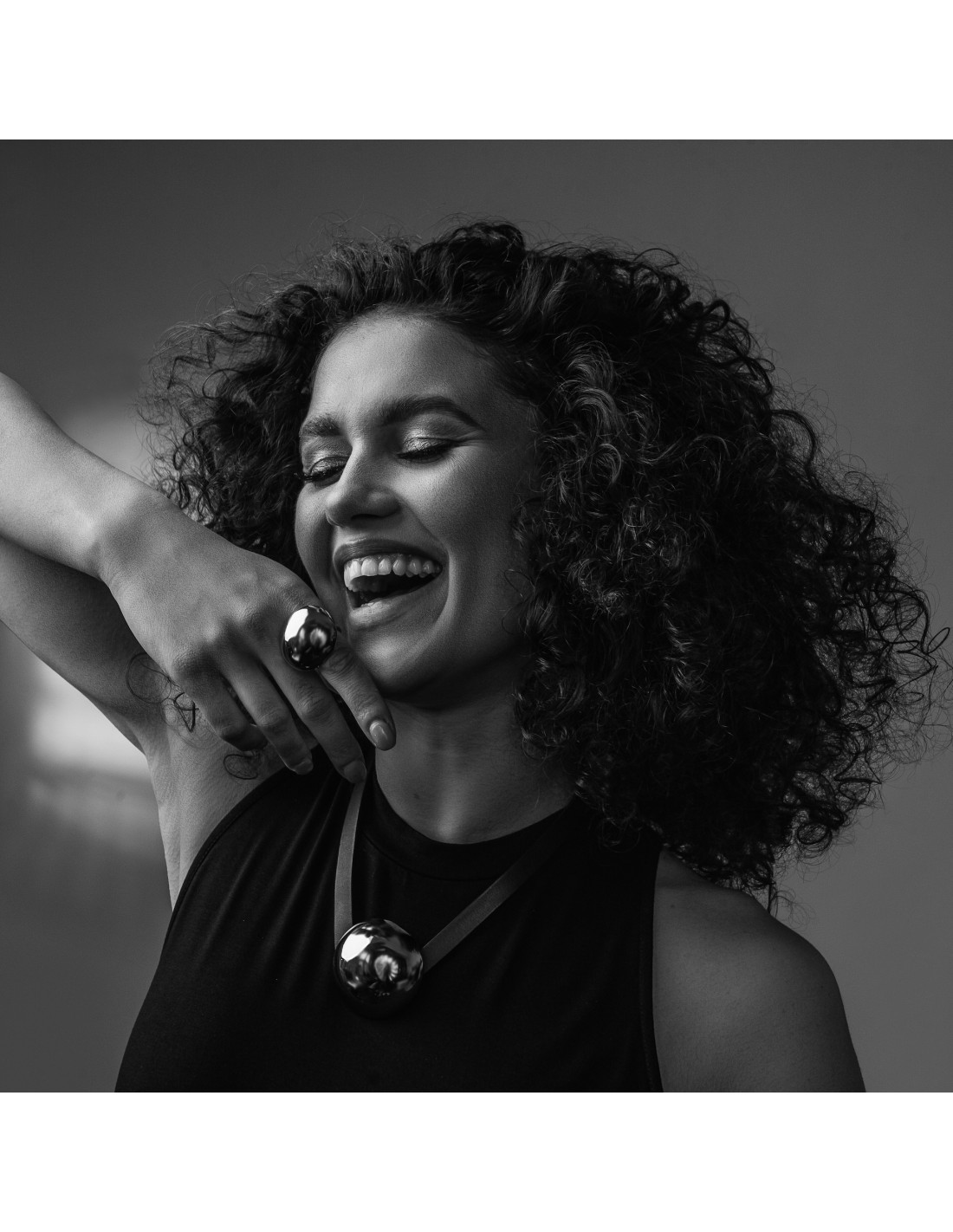 This black leather bracelet with a large matte steel sphere is a striking, handcrafted accessory with a sculptural look. Perfect for pairing with matching necklace or ring.Product code: BSpm006