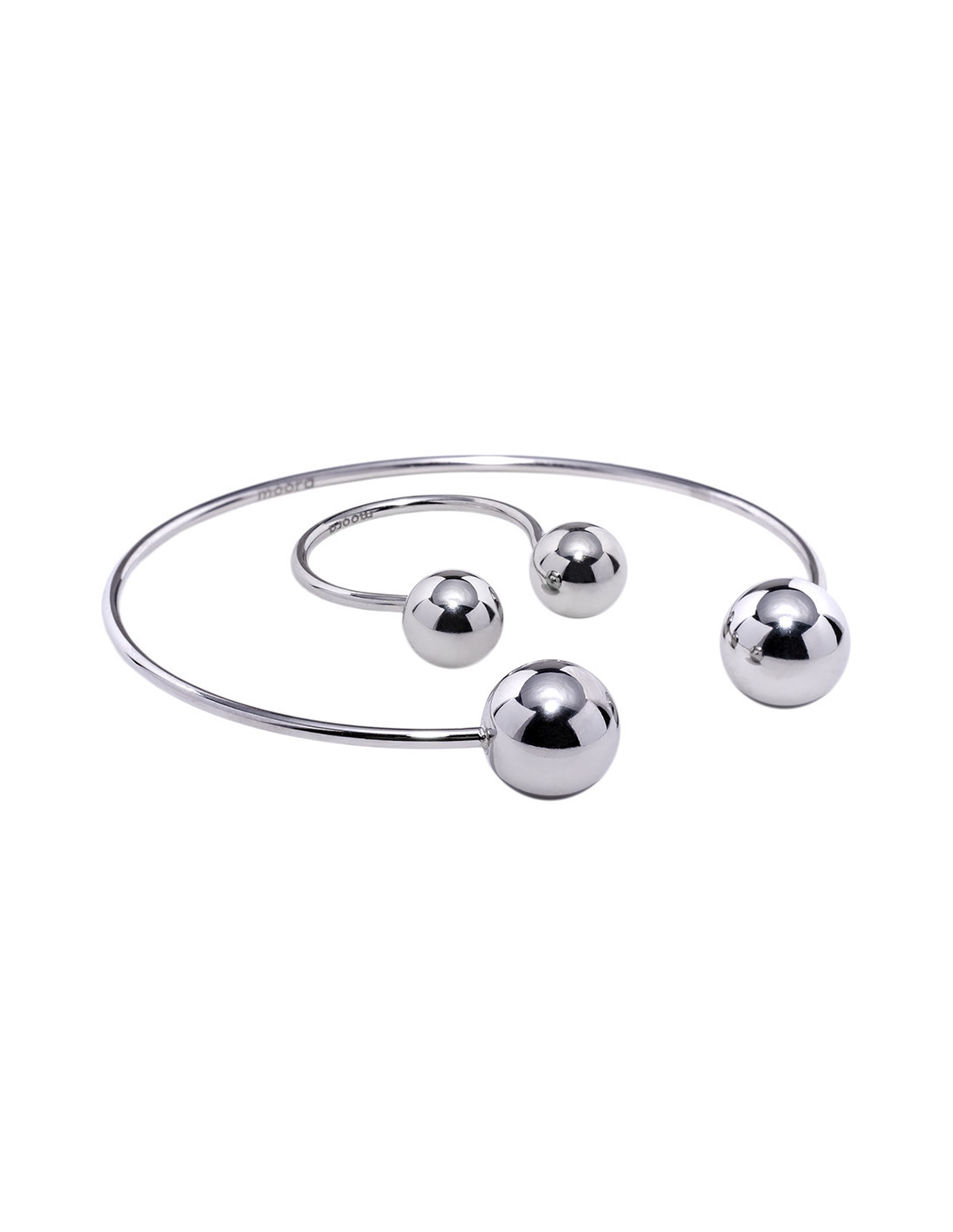 Minimalist, simple, modern stainless steel ring finished with two balls.