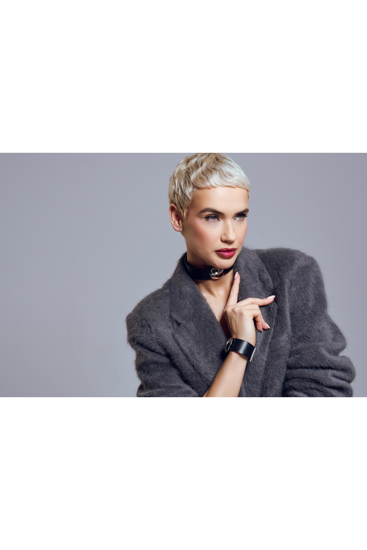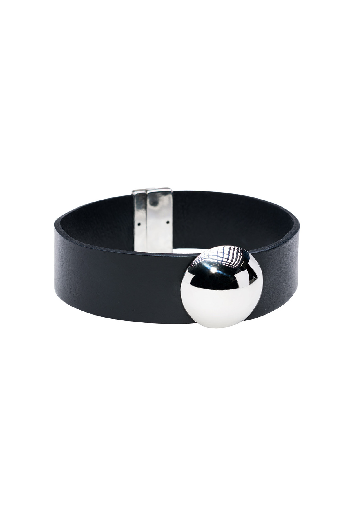 A handcrafted choker made of black genuine leather and stainless steel is a modern expression of style and elegance. The distinctive golden or silver steel hemisphere adds character and draws attention. The wide leather form fits perfectly around the neck. Ideal as a standalone piece or paired with a matching bracelet.